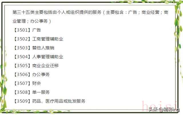 2.進出口貿(mào)易公司、電商等銷售交易服務(wù)。注冊的核心商品內(nèi)容為:進出口代理350005、市場營銷350106、電話市場營銷350107、為商品和服務(wù)的買賣雙方提供在線市場350120。特別 注意的是最后的“為商品和服務(wù)…...提供在線市場”是2015年1月1日最新出現(xiàn)的,之前是沒有的。也是標(biāo)志著電商服務(wù)商標(biāo)的明確。