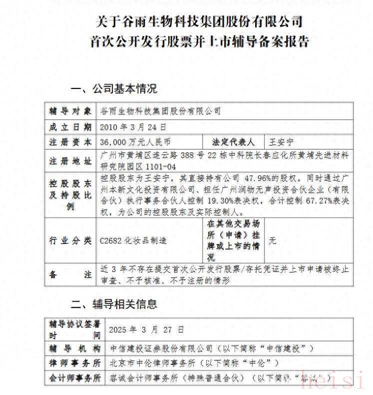 據(jù)證監(jiān)會(huì)官網(wǎng),3月27日,廣州本土護(hù)膚品牌谷雨主體企業(yè)谷雨生物科技集團(tuán)股份有限公司與中信建投簽署上市輔導(dǎo)協(xié)議,并于3月31日向廣東證監(jiān)局提交了上市輔導(dǎo)備案報(bào)告。