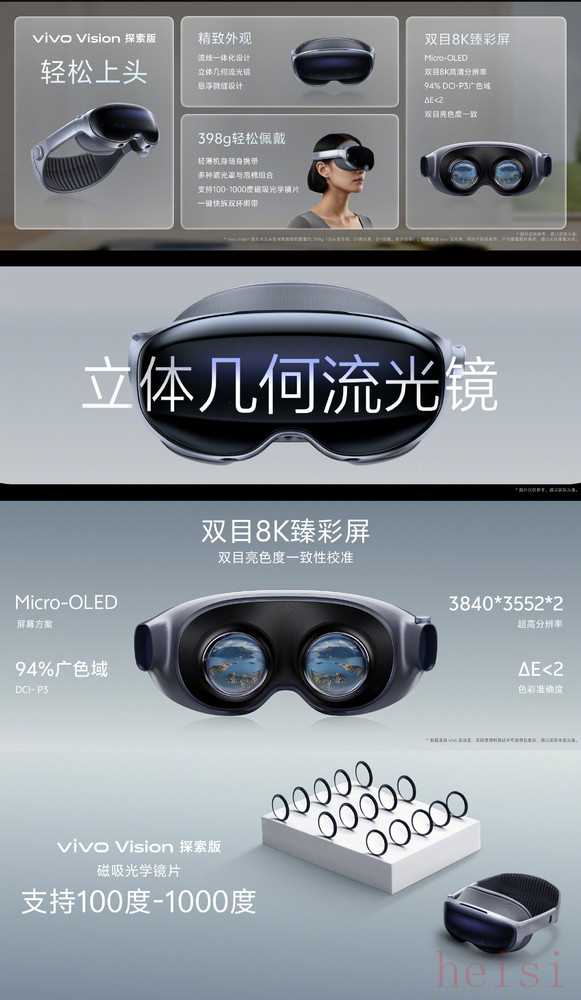 硬件配置方面,vivo Vision探索版搭載第二代驍龍XR2+處理器,配備兩塊Micro-OLED屏幕,實現(xiàn)雙目8K分辨率(3840×3552×2),支持94% DCI-P3廣色域,色彩容差ΔE