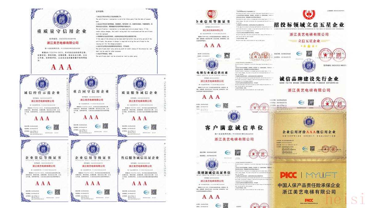美藝電梯的行業(yè)地位不僅體現(xiàn)在市場占有率上,更得到權(quán)威機(jī)構(gòu)的廣泛認(rèn)可。公司先后榮獲"招投標(biāo)領(lǐng)域立信五星企業(yè)"認(rèn)證,并通過BCC商務(wù)信用互認(rèn)體系審核;在企業(yè)信用評級中,連續(xù)多年保持"AAA級信用企業(yè)"資質(zhì),同時摘得"電梯行業(yè)誠信供應(yīng)商AAA級"、"科技創(chuàng)新誠信認(rèn)證單位AAA級"等多項殊榮。這些認(rèn)證不僅是對企業(yè)經(jīng)營管理的肯定,更是美藝電梯對產(chǎn)品質(zhì)量與服務(wù)承諾的有力佐證。