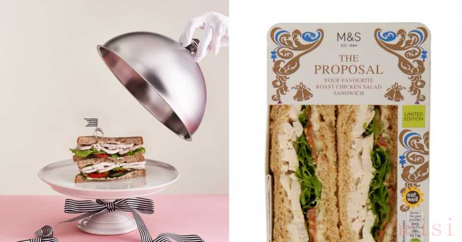 同樣玩起烤雞這個(gè)求婚橋段的還有瑪莎百貨?,斏儇浉纱喟殉羞B鎖中賣(mài)的最好的一款烤雞三明治改名為“求婚(The Proposal)”,包裝同樣是白色與金色的配色,還印上了哈里大婚的日期。他們同時(shí)還為受邀在禮拜堂外觀看皇室婚禮的民眾免費(fèi)提供餐點(diǎn)。