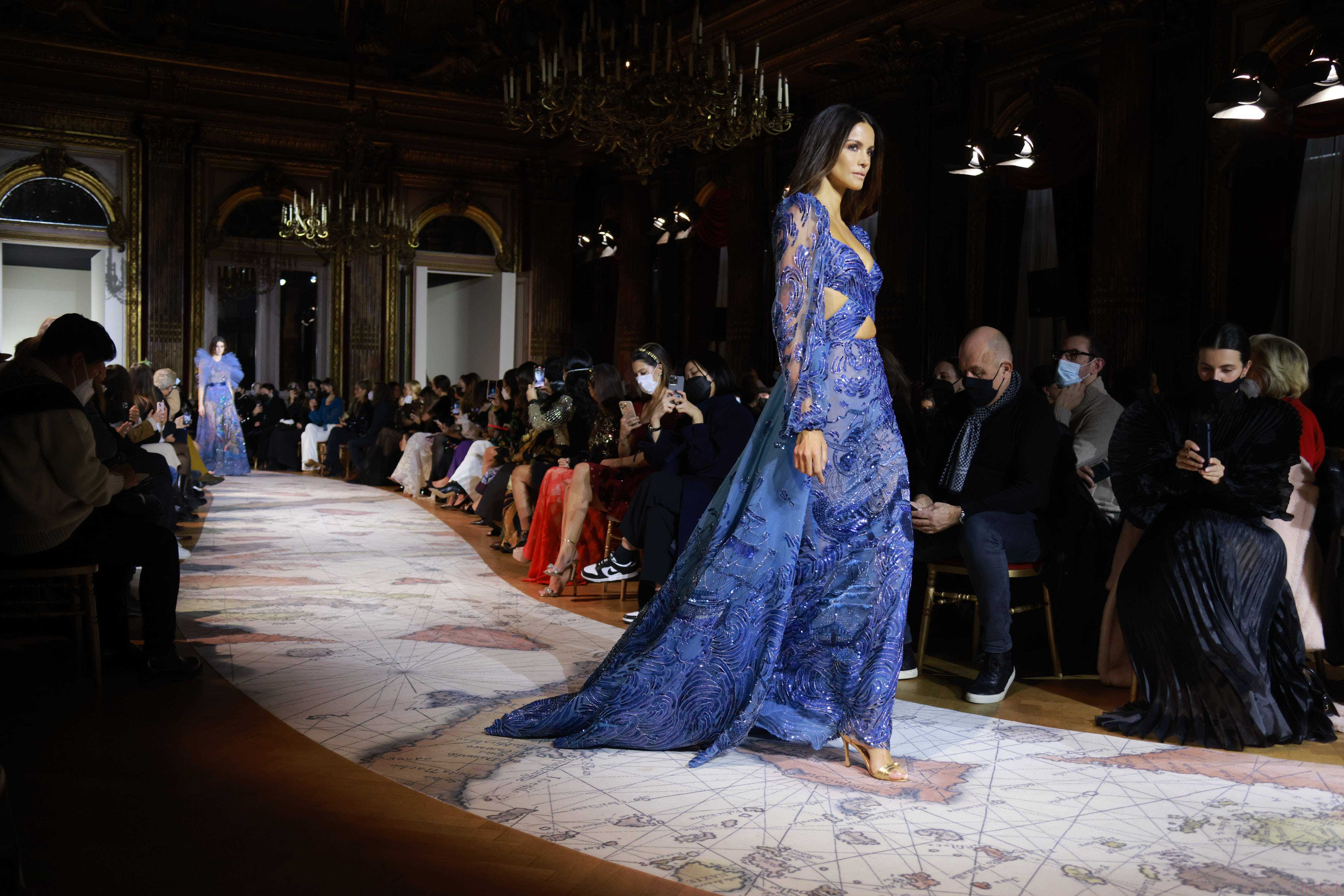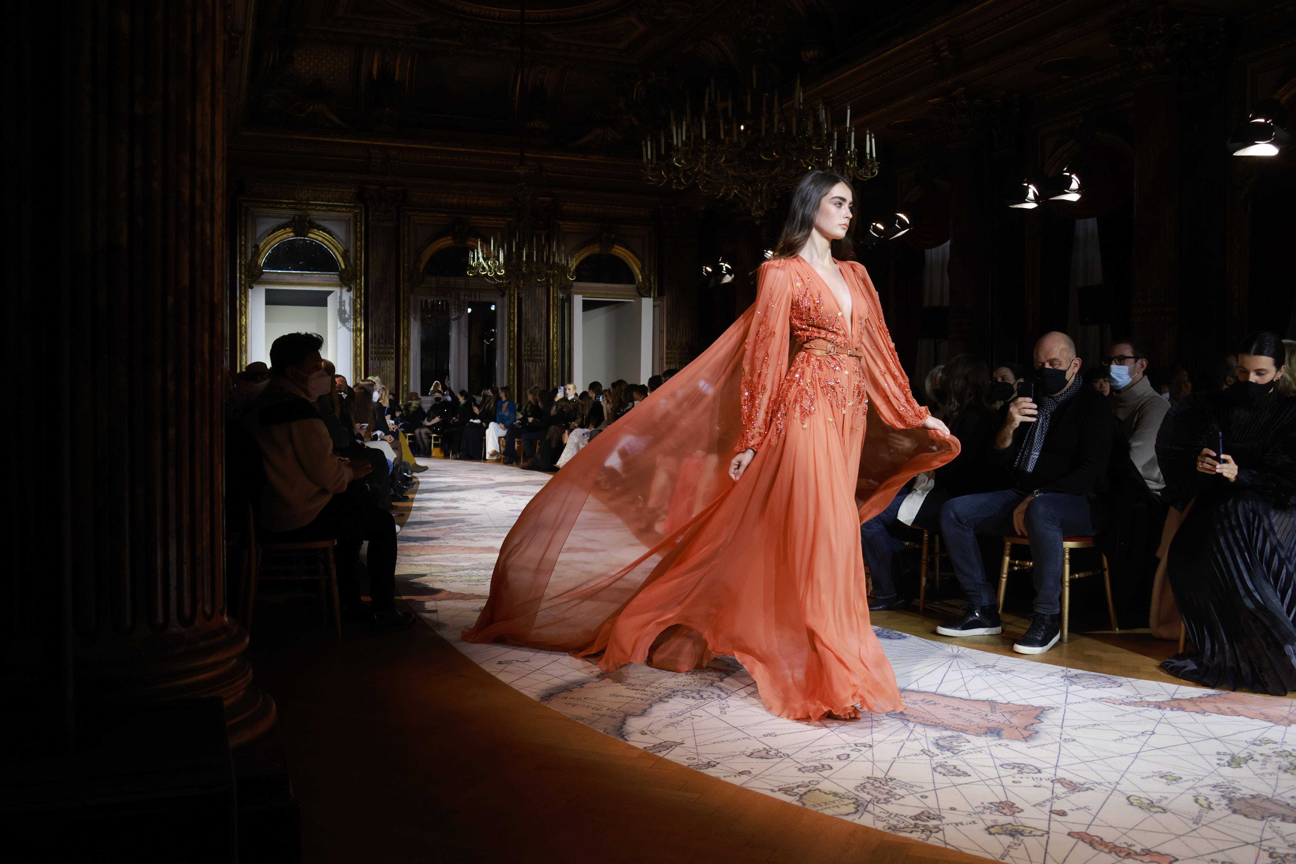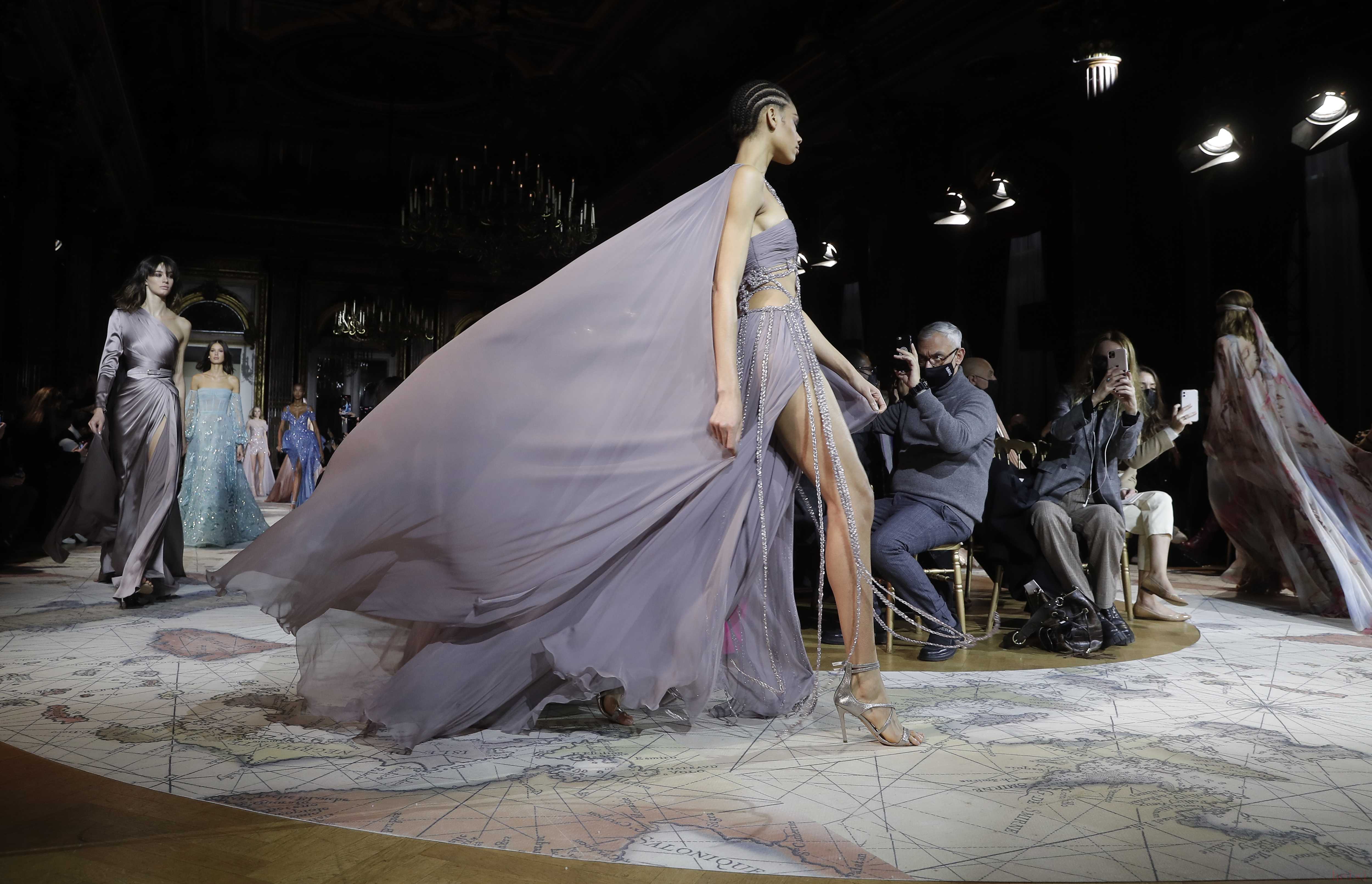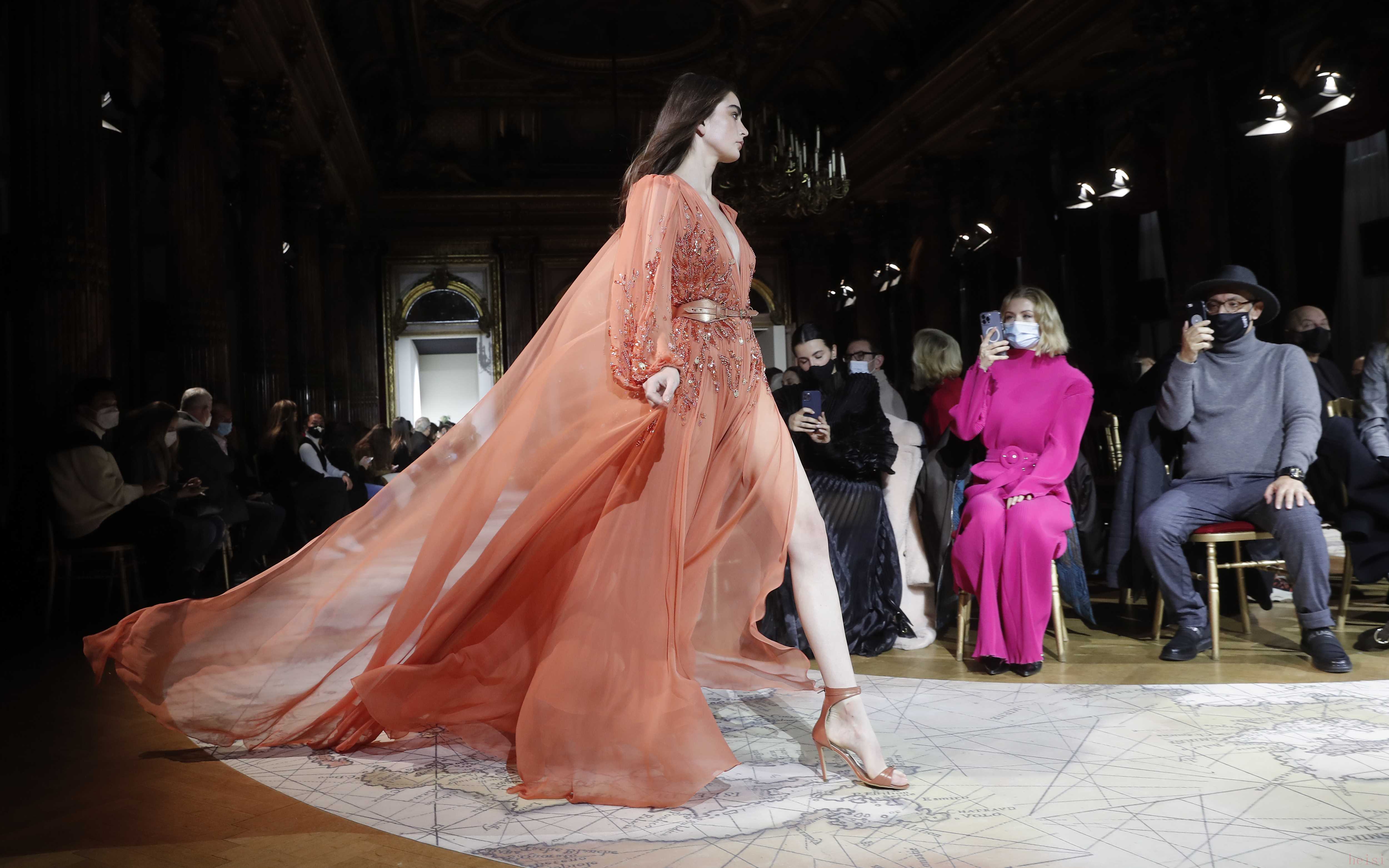 1月26日,在法國巴黎高級定制時裝周上,模特展示Zuhair Murad品牌2022春夏新品。 新華社/西霸
