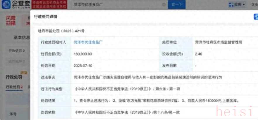 據(jù)企查查APP顯示,“東方爽茶”生產(chǎn)商菏澤市優(yōu)佳食品廠成立于2010年12月,此前就因涉及商標(biāo)侵權(quán)等問題,被光明乳業(yè)(600597.SH)、達利食品(03799.HK)等多家企業(yè)起訴。