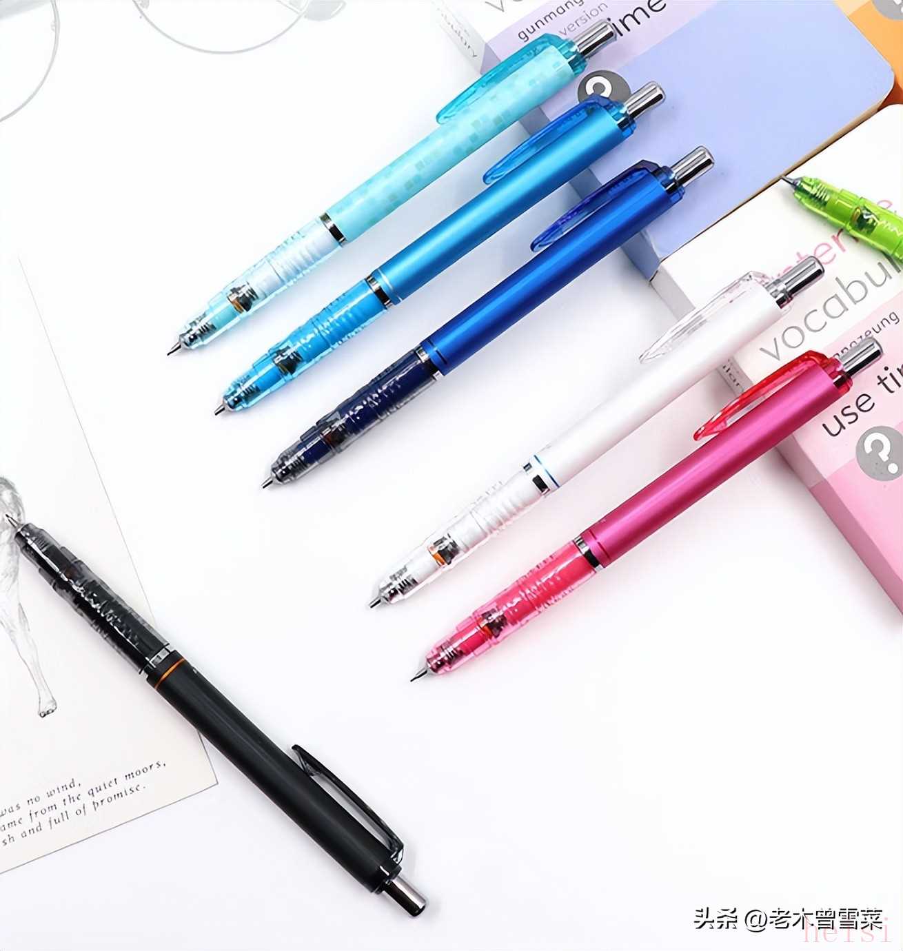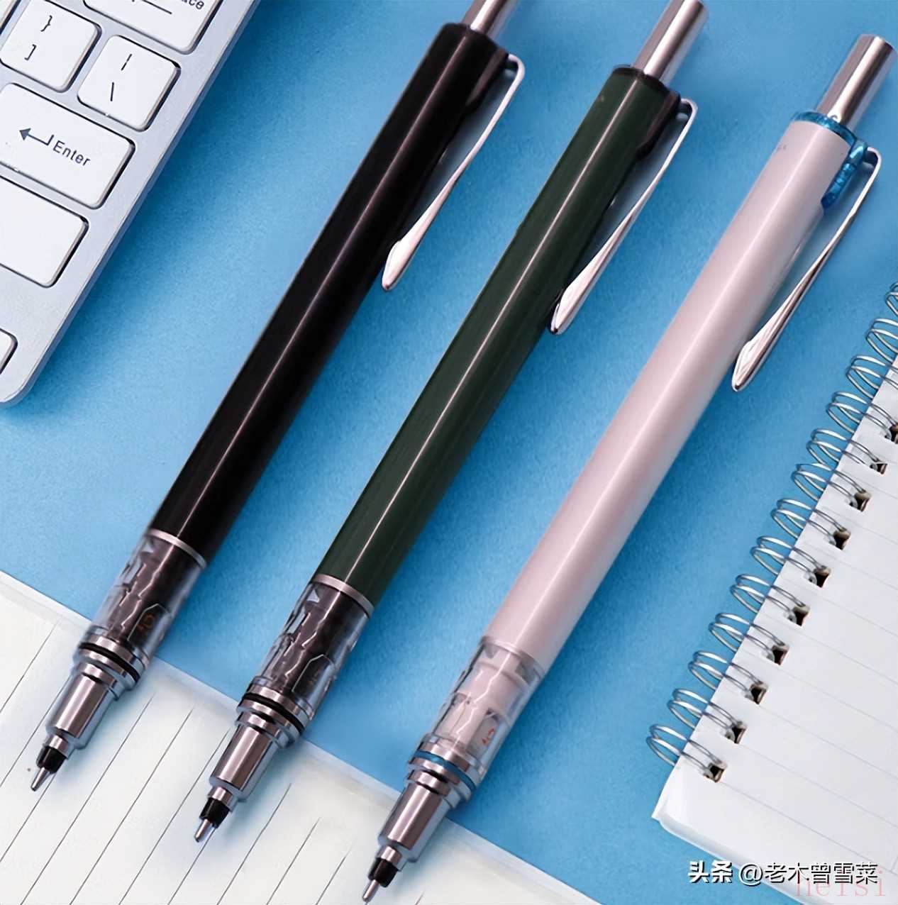 uni最新技術(shù)的中性筆,簡潔設計,墨水可以固化在紙張表面而不過分滲入,色彩濃郁更清晰,并且耐水,如果不為了柔軟筆握,這就是最能代表uni技術(shù)的中性筆。uni M5-559自動旋轉(zhuǎn)自動鉛