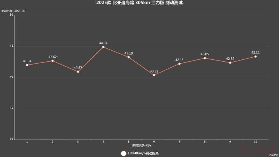 雖說最低配的海鷗只配備了4只胎寬165mm的輪胎以及鋼圈,但測試成績并沒有特別拉胯,最終100-0km/h的制動距離為40.31米。10次測試中成績波動不大,最長的一次制動是第4次測試,100-0km/h的制動距離為44.84米。