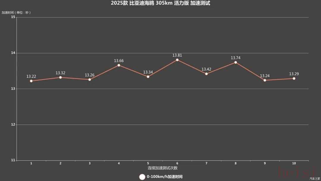 首先進行的是0-100km/h加速測試,在測試前我們將空調(diào)關(guān)閉,駕駛模式調(diào)整至運動模式,ESP關(guān)閉,最終0-100km/h的加速成績?yōu)?3.22秒,最慢的一次測試為13.81秒。