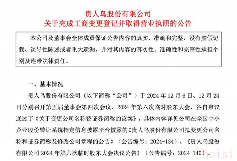 據(jù)公告,貴人鳥股份有限公司(以下簡稱“公司”)于2024年12月6日、12月24日分別召開第五屆董事會(huì)第四次會(huì)議、2024 年第六次臨時(shí)股東大會(huì),各自審議通過了《關(guān)于變更公司名稱暨證券簡稱的議案》。