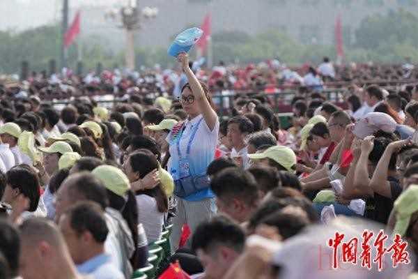9月3日,北京天安門廣場(chǎng),紀(jì)念中國(guó)人民抗日戰(zhàn)爭(zhēng)暨世界反法西斯戰(zhàn)爭(zhēng)勝利80周年大會(huì)現(xiàn)場(chǎng),一名志愿者示意觀眾脫帽。中青報(bào)·中青網(wǎng)記者李雋輝/攝