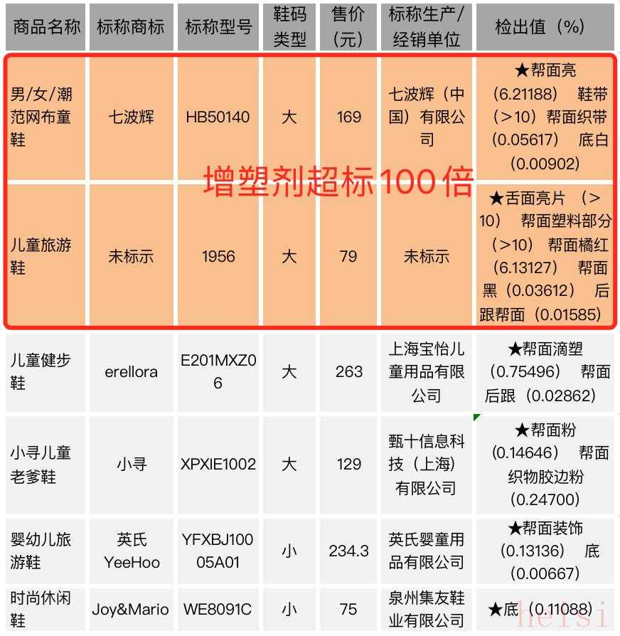 不可忍的是,七波輝(型號(hào):HB50140)和拼多多智趣猴童鞋旗艦店銷售的兒童旅游鞋(型號(hào):1956),兩款童鞋鄰苯二甲酸酯檢出值竟然超過(guò)限量值100倍以上。