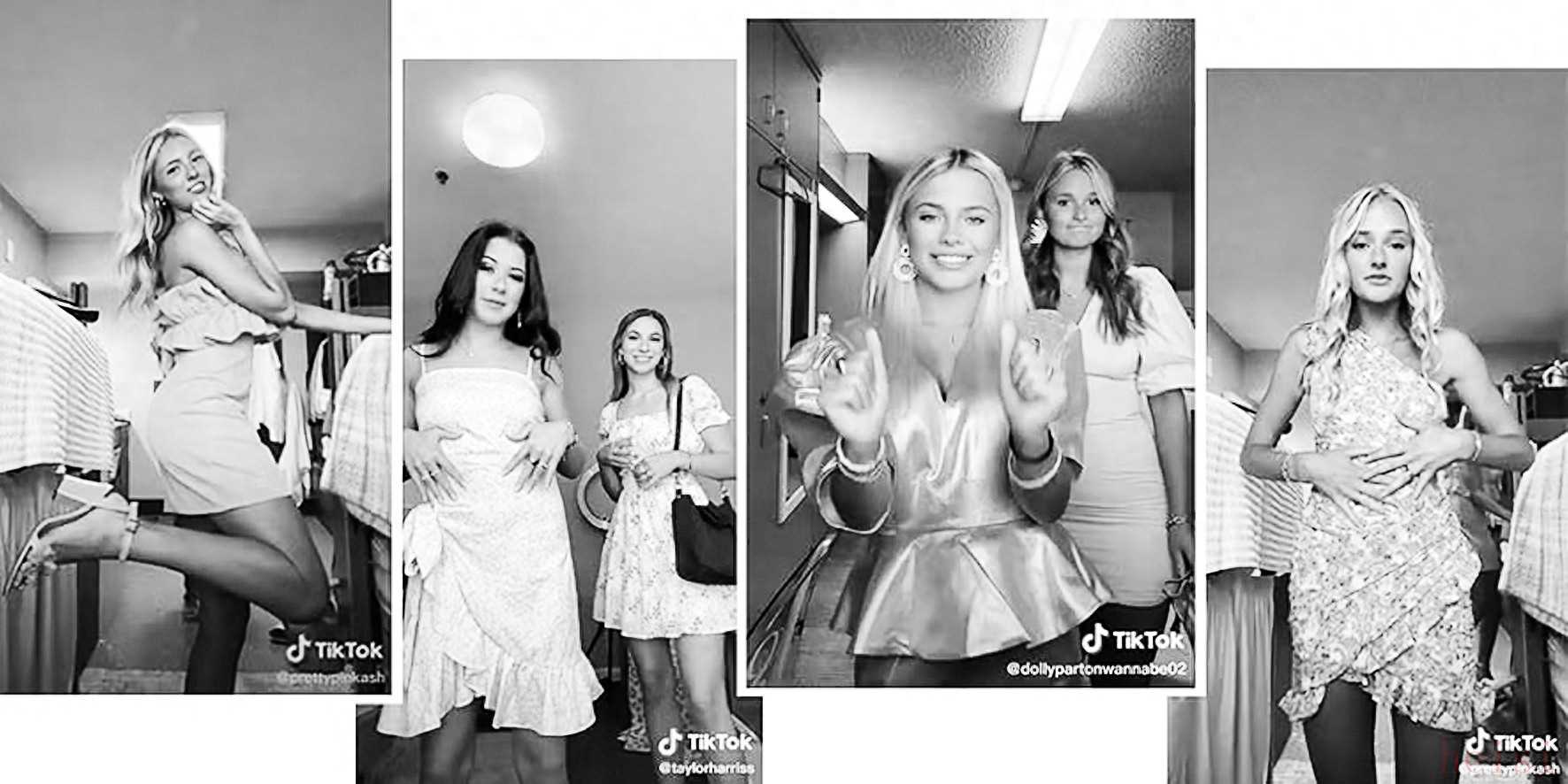 這一波“校園熱”與社交媒體上的RushTok(一種在TikTok上爆火的視頻內容形式,圍繞美國大學招新過程,拍攝服裝搭配、化妝教程、心路歷程等視頻——編者注)密切相關。RushTok起源于2021年,美國阿拉巴馬大學的女生們在TikTok上記錄加入精英姐妹會的全過程,其中最吸引人的是校園穿搭視頻(如圖)。瘦削的白人金發(fā)少女展示品牌單品的視頻內容迅速出圈,讓許多原本對姐妹會一無所知的海外觀眾也開始模仿。幾年后,一年一度的“招新季”已變得像一檔真人秀,各品牌自然蜂擁而上。