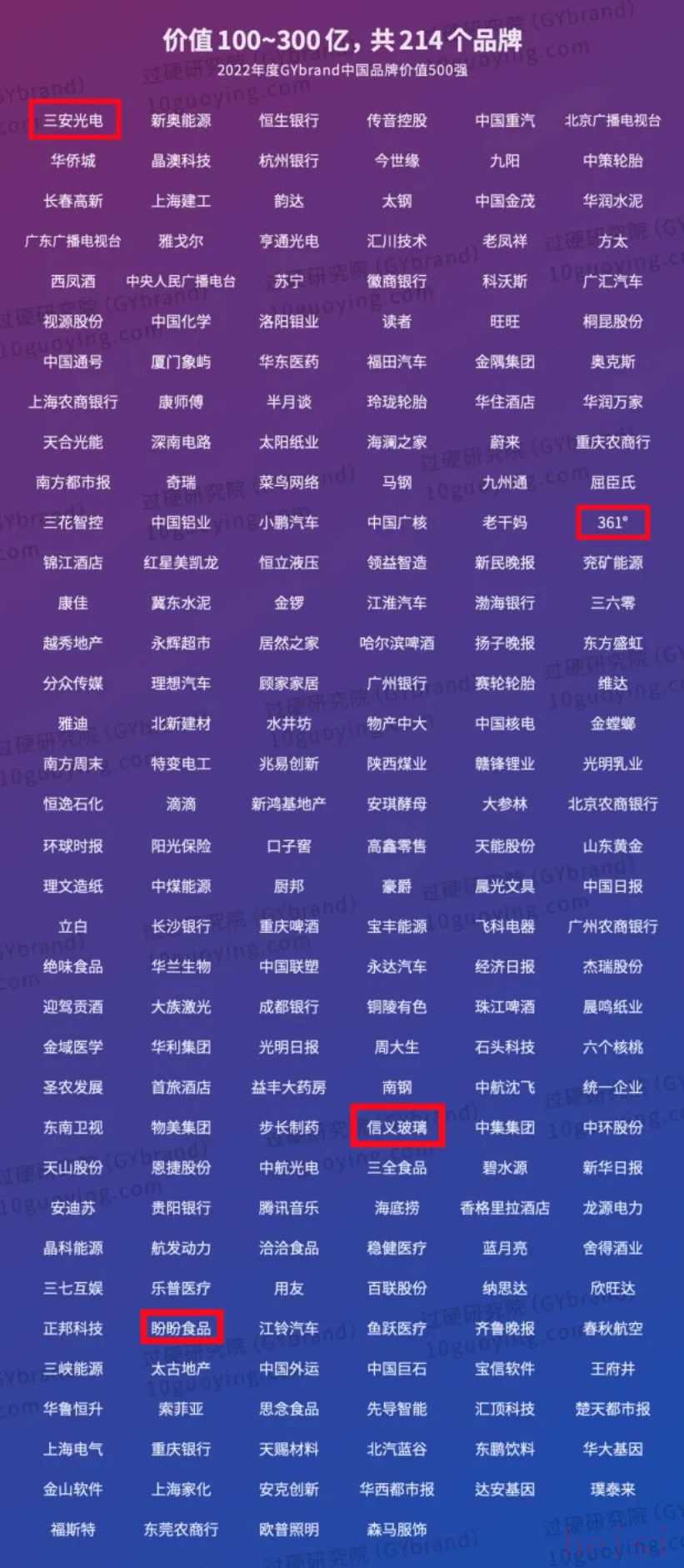 在品牌價(jià)值100億元—300億元的榜單中,三安光電、361°、信義玻璃、盼盼食品上榜。