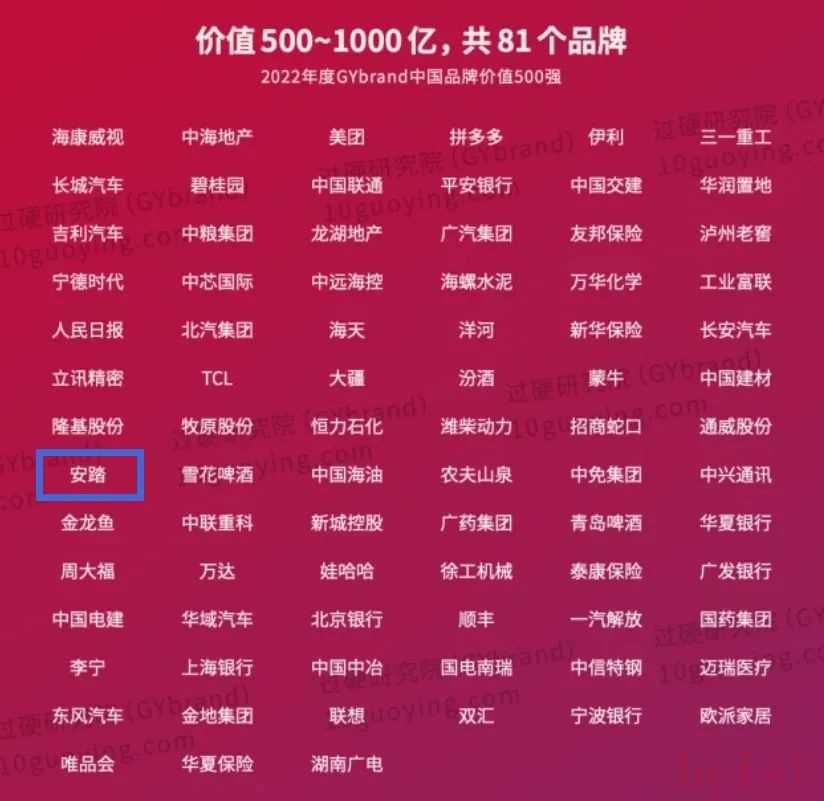 在品牌價(jià)值500億元—1000億元的榜單中,安踏與其余80個(gè)國(guó)內(nèi)品牌名列其中。