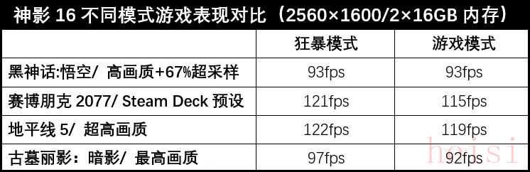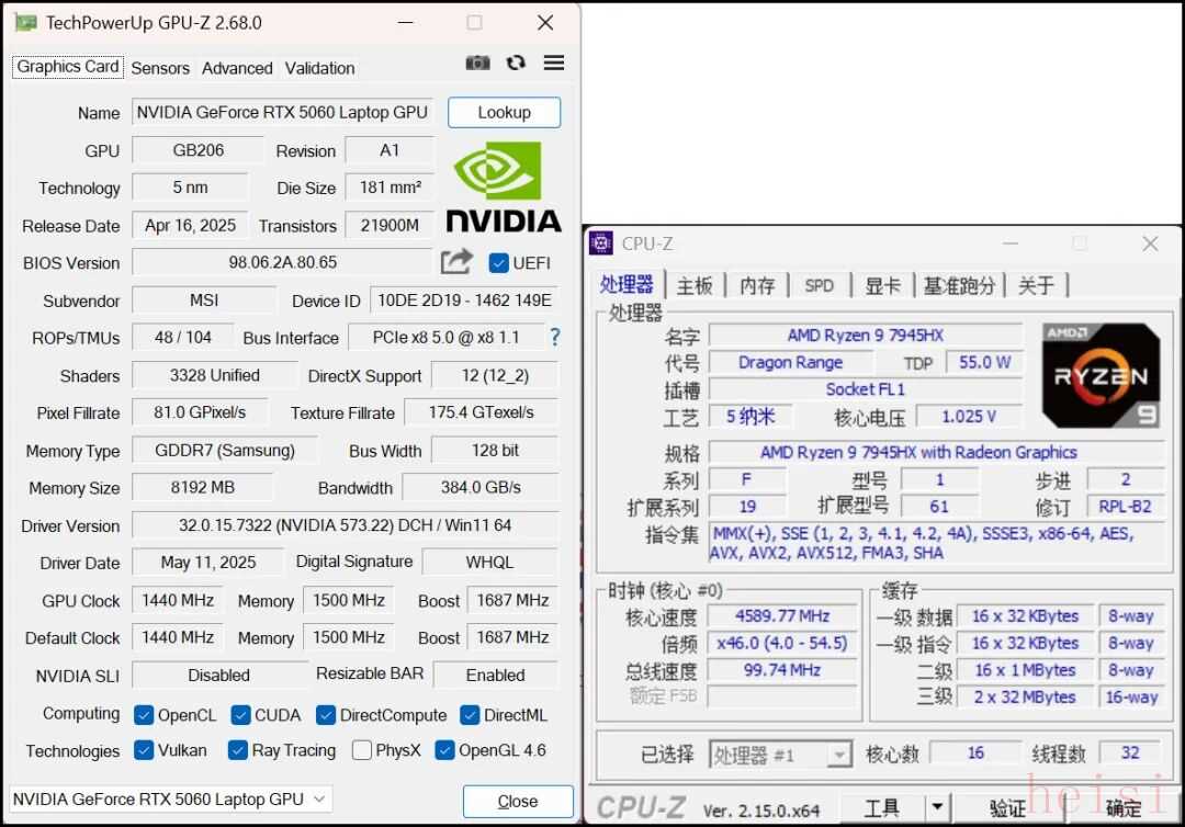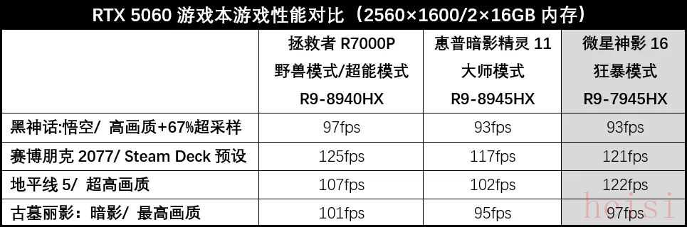 采用Blackwell架構(gòu),支持DLSS4和多幀生成技術(shù),支持第4代RT Core和第五代Tensor Core,標(biāo)準(zhǔn)功耗115W的移動(dòng)版RTX 5060獨(dú)顯,是RTX 50系移動(dòng)顯卡的最主流款型,大家都已經(jīng)很熟悉了,就不贅述啦。這里反而要多說(shuō)兩嘴該機(jī)的處理器R9 7945HX:這兩年游戲本市場(chǎng)的主力是N-1、N-2代的處理器,比如英特爾平臺(tái)銷(xiāo)售主力是10nm制程的13代、14代酷睿HX,AMD這邊以銳龍7000HX、8000HX為主力。神影16銳龍版采用的是N-2的Ryzen 9 7945HX,聽(tīng)起來(lái)似乎“有點(diǎn)老”,但實(shí)則不然:一方面Ryzen 8000HX基本就是Ryzen 7000HX的馬甲,可視為一代;另一方面,Ryzen 7000HX和8000HX(的計(jì)算單元部分)都是臺(tái)積電5nm制程產(chǎn)物,其性能比隔壁的同時(shí)代酷睿HX要強(qiáng)得多!而R9 7945HX則是7000HX時(shí)代的旗艦款型,16核32線程,算是“游戲、專(zhuān)業(yè)應(yīng)用一把抓”的全能選手。先來(lái)看游戲表現(xiàn)。我們正好有其他兩款16核32線程的Ryzen 9處理器RTX 5060游戲本,大家可簡(jiǎn)單對(duì)比一下。注意,為了統(tǒng)一測(cè)試環(huán)境,也為了充分發(fā)揮專(zhuān)業(yè)應(yīng)用性能,我們都統(tǒng)一在2×16GB內(nèi)存環(huán)境下進(jìn)行(提示:2×16GB內(nèi)存相較1×16GB內(nèi)存,對(duì)大型3A游戲幀速影響不大,但對(duì)網(wǎng)游,以及各種專(zhuān)業(yè)應(yīng)用的性能提升很大。)