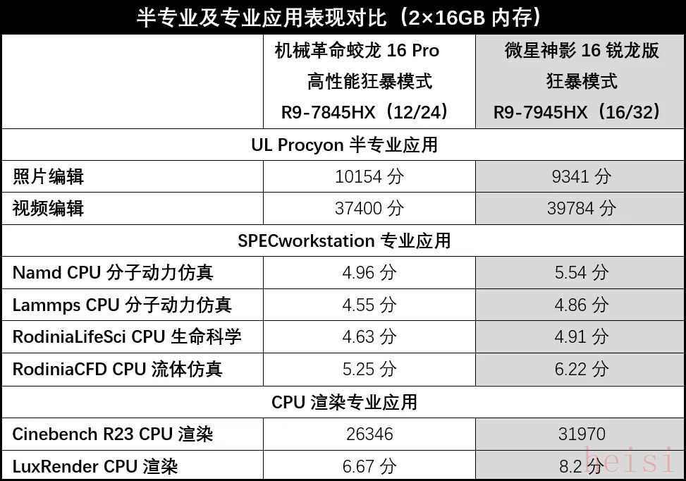 再來(lái)看看半專(zhuān)業(yè)應(yīng)用(照片編輯、視頻編輯)以及純吃處理器性能的專(zhuān)業(yè)應(yīng)用表現(xiàn)▼。再次提醒,如今絕大部分省份已沒(méi)有電腦國(guó)補(bǔ)了,所以,當(dāng)我們以“原價(jià)”購(gòu)買(mǎi)游戲本時(shí),補(bǔ)齊內(nèi)存的成本占比已非常小,建議大家一定把內(nèi)存補(bǔ)齊到2×16GB,半專(zhuān)業(yè)應(yīng)用和專(zhuān)業(yè)應(yīng)用的性能會(huì)大幅提升。