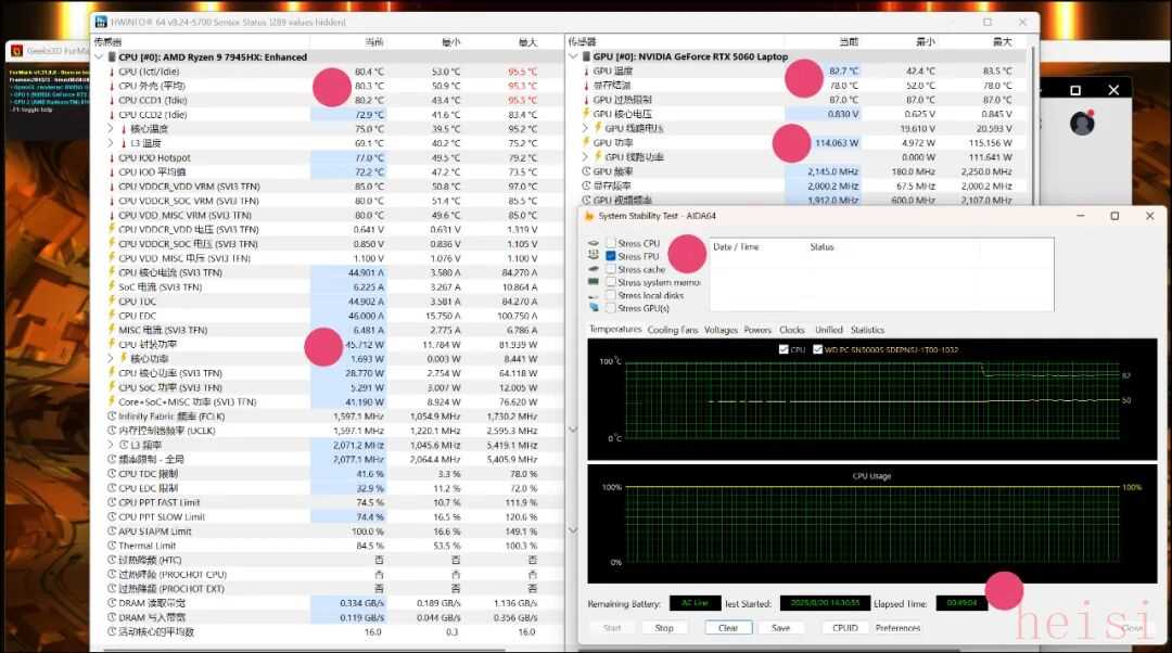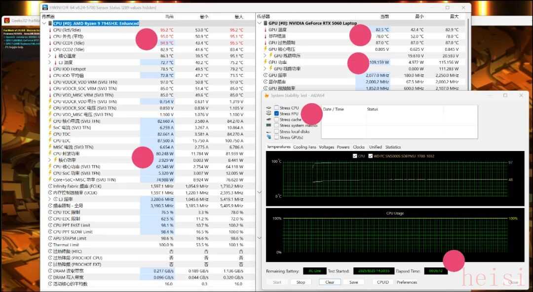 狂暴模式雙考36分鐘,核心功率組合190W,其中,處理器功率穩(wěn)定80W,內(nèi)部溫度95.2℃;RTX 5060獨(dú)顯109W,82.5℃。此時(shí)整機(jī)電表功耗已超過(guò)適配器的240W,開(kāi)始從電池取電。另外風(fēng)扇噪音也會(huì)達(dá)到前面說(shuō)的60dBA+。